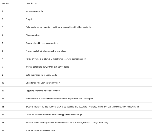 The current state of the fiber arts apps has focused primarily on the distribution of existing patterns. What existing products/services fail to address is the ability to generate a pattern easily and immediately know what materials are needed. Our product/service will address this gap by providing a pattern and material list generator based on user’s design input.