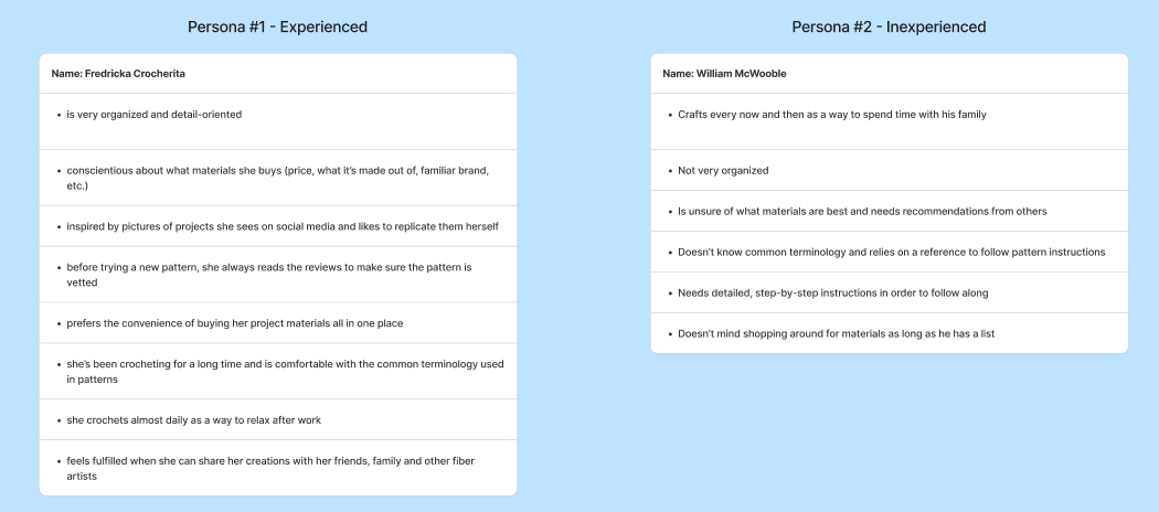 Our project consisted of both research and modeling phases. The research phase consisted of lit reviews, competitive reviews and a series of interviews. Each group member completed a write up of different aspects of the domain and an analysis of our would be competitors. The 5 interviews consisted of questions relating to fiber arts experience, Ui preferences and various other things to help us get a general overview of how our product should function. During the modeling phase we compiled all of the information that we gained from our research and developed a low fidelity prototype and eventually an MVP.