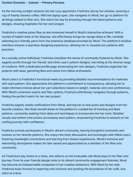 We came up with a context scenario that was derived from our personas and user goals. It described a very high detailed interaction between our personas and our product.