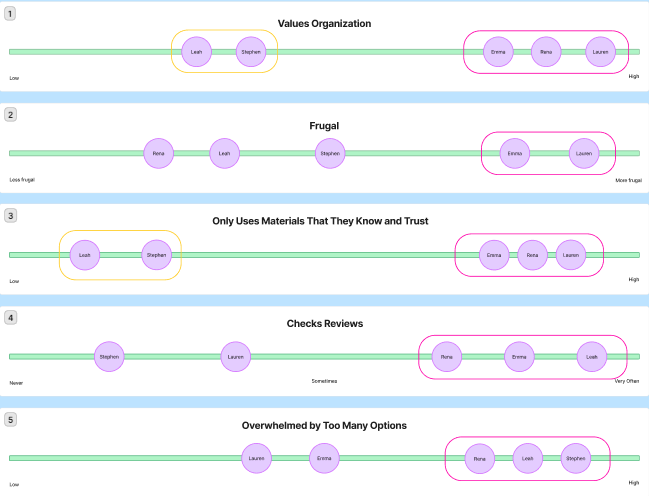 We grouped different variables and takeaways from our interviews so that we could identify which ones were most important and prominent in our users. We separated them by color based on the strength of the correlation. After that we highlighted key characteristics and goals and assigned them different user types to base our personas off of.