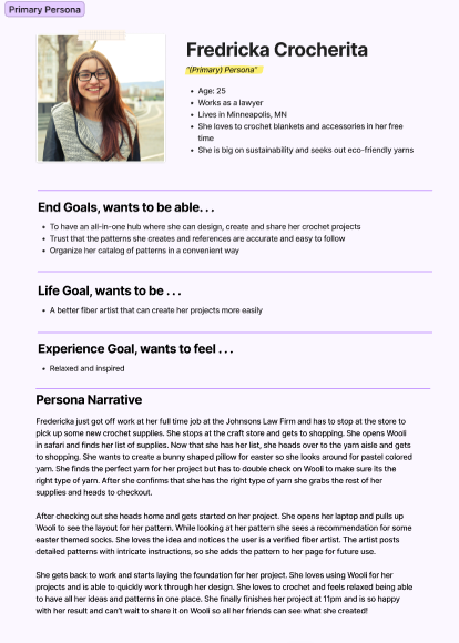 The persona narrative is a day-in-the-life depiction of the persona. It provides a detailed look at their daily activities based on their characteristics and goals. Instead of focusing on the product, we wanted to dive deeper and offer an in-depth snapshot of their behaviors.